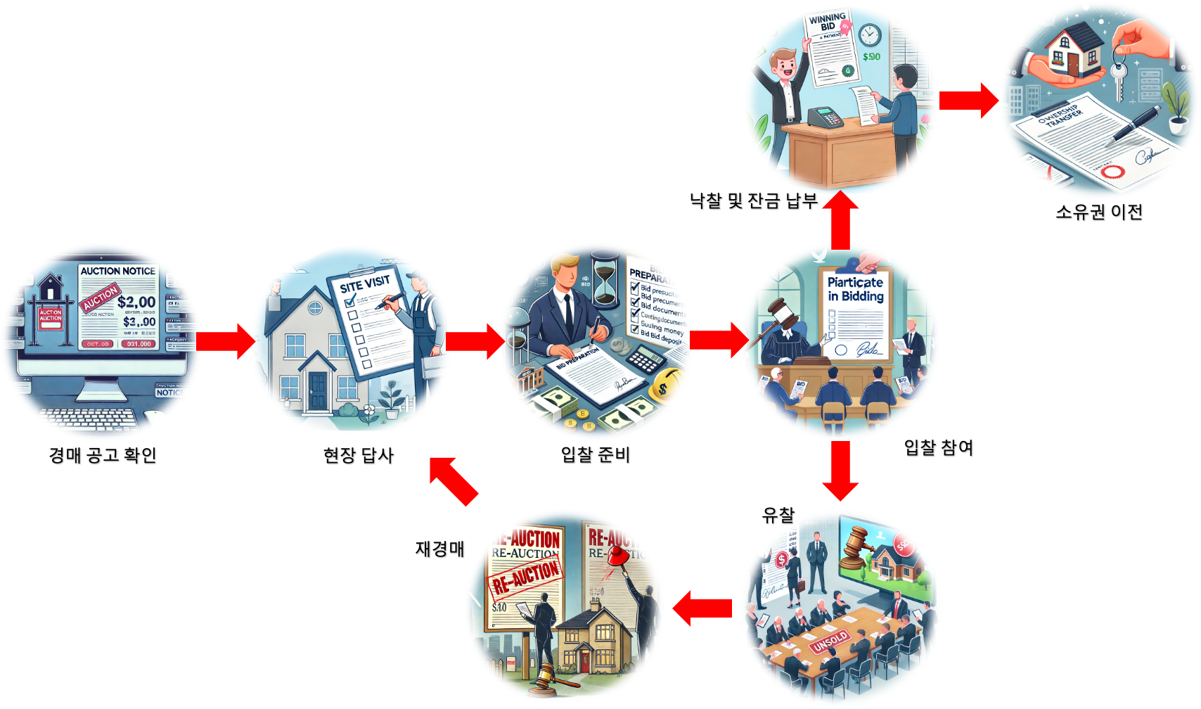 부동산 경매는 몇 가지 단계로 이루어집니다. 그림과 함께 쉽게 설명해드릴게요.